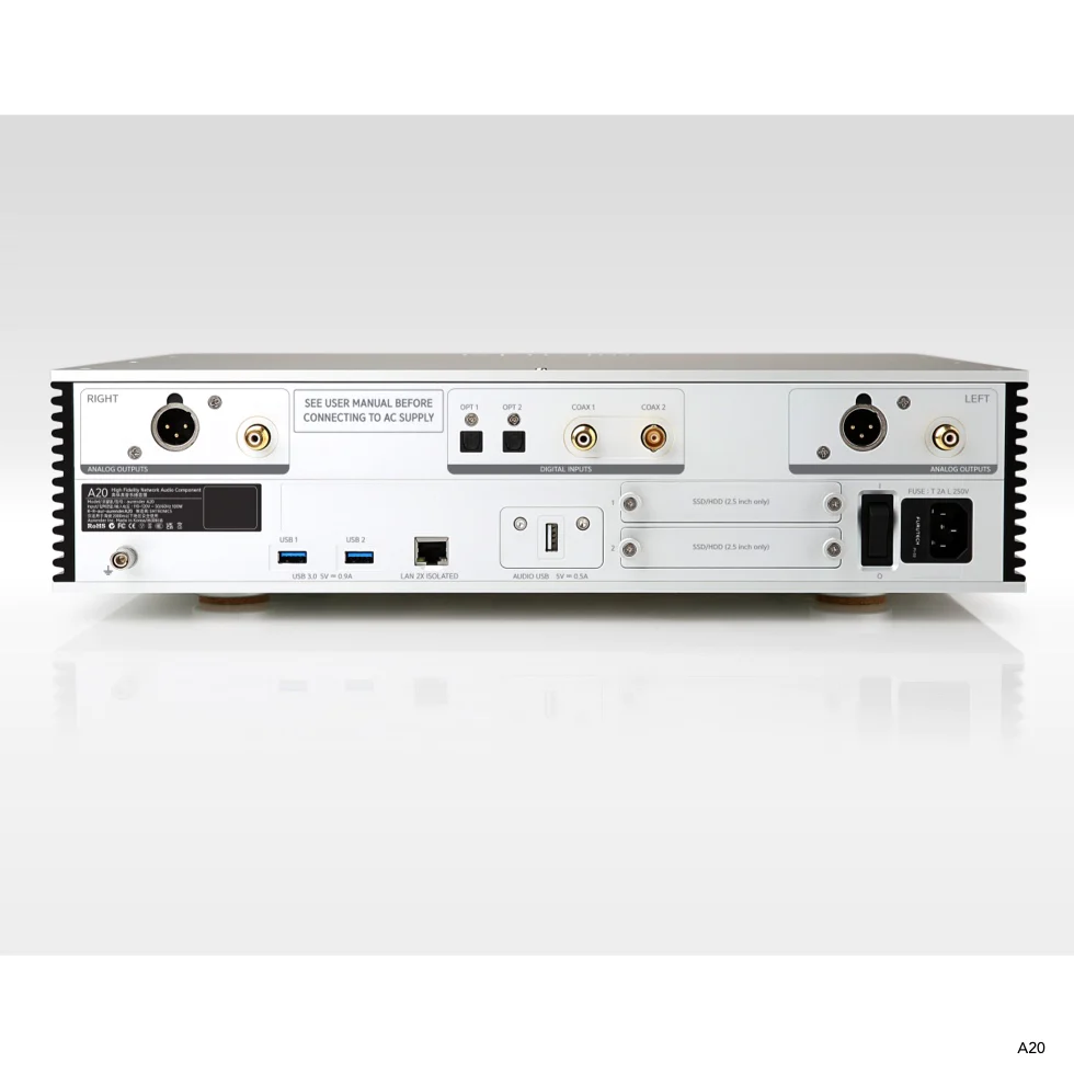The A20, shares the same basic circuitry topologies, DAC chipset and form factor as the flagship A30. However, it dispenses with the CD ripping functionality, metadata editing software and the headphone connection provided is a single standard 1⁄4” jack. By being scaled back, the A20 will appeal to the digital music lover whose library is already digitised and wants a full-fledged, high-performance server, streamer, preamplifier, DAC and headphone amplifier.